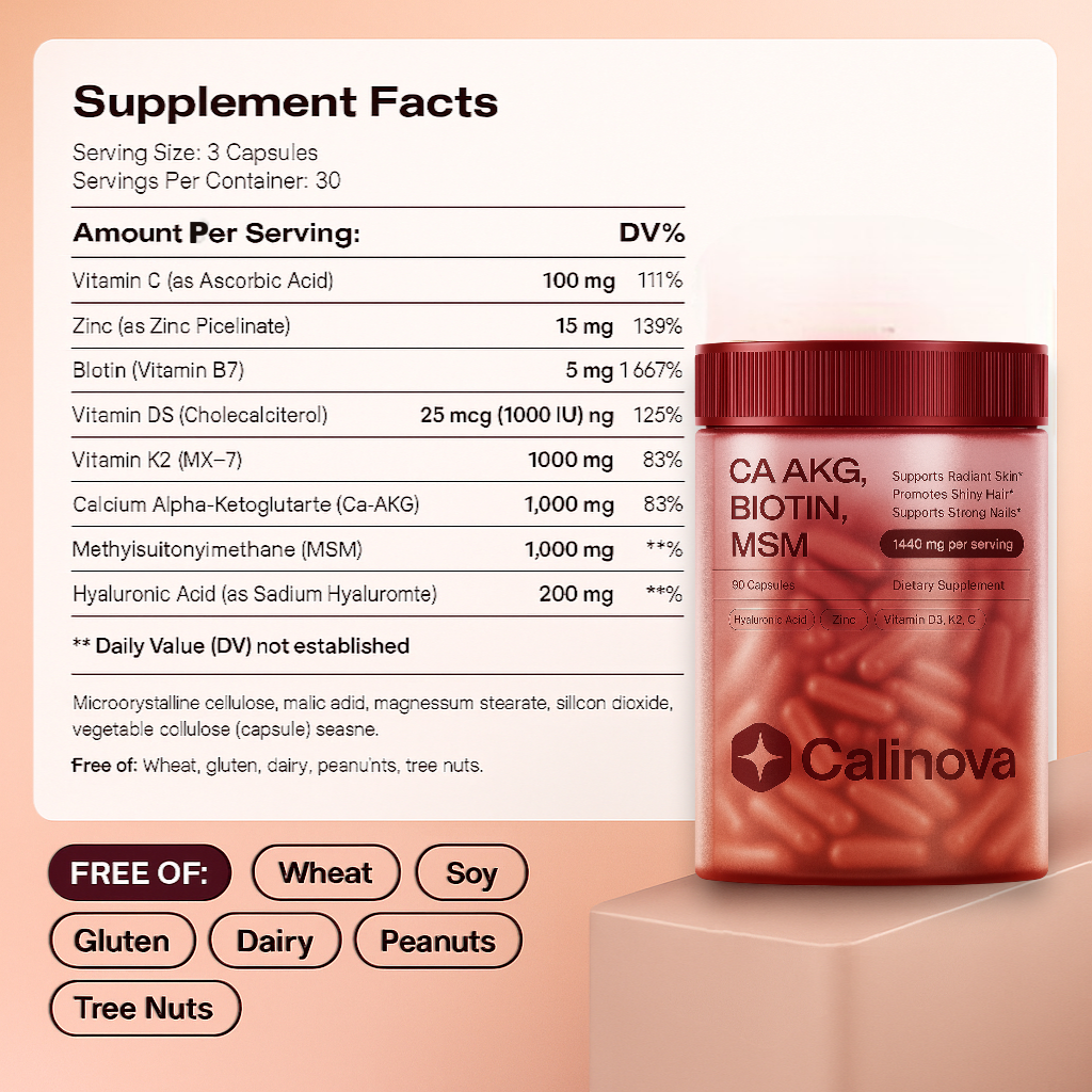 Powered by a clinical 1000 mg dose of Ca-AKG for cellular renewal, 120 mg of Hyaluronic Acid for deep hydration, and a synergistic blend of MSM, Biotin, Zinc, and Vitamin C for collagen support, this advanced formula delivers results traditional beauty products can’t reach.